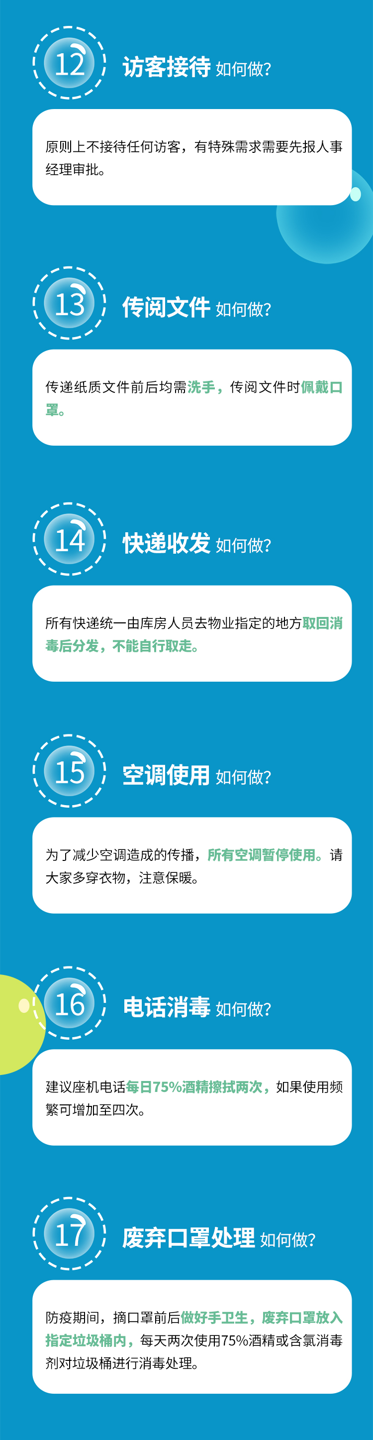 所有人员必须完成每日健康上报。按国家防疫要求,非疫情严重地区员工应提前14天自我隔离,每日测量体温,不走亲访友,减少公共积聚场所,14天体温正常者再至公司上班。远程办公人员做好自我隔离和必要的防护。