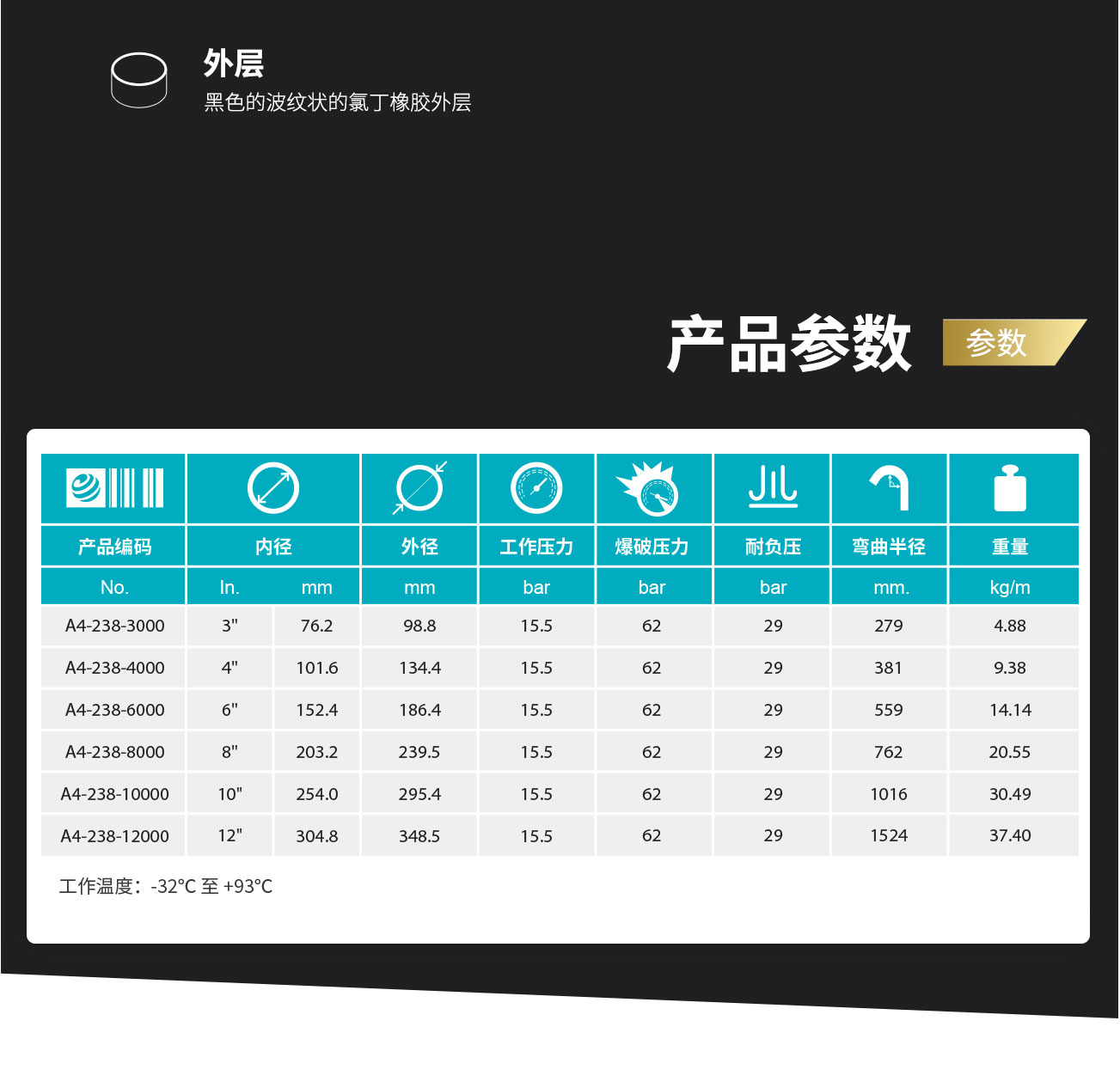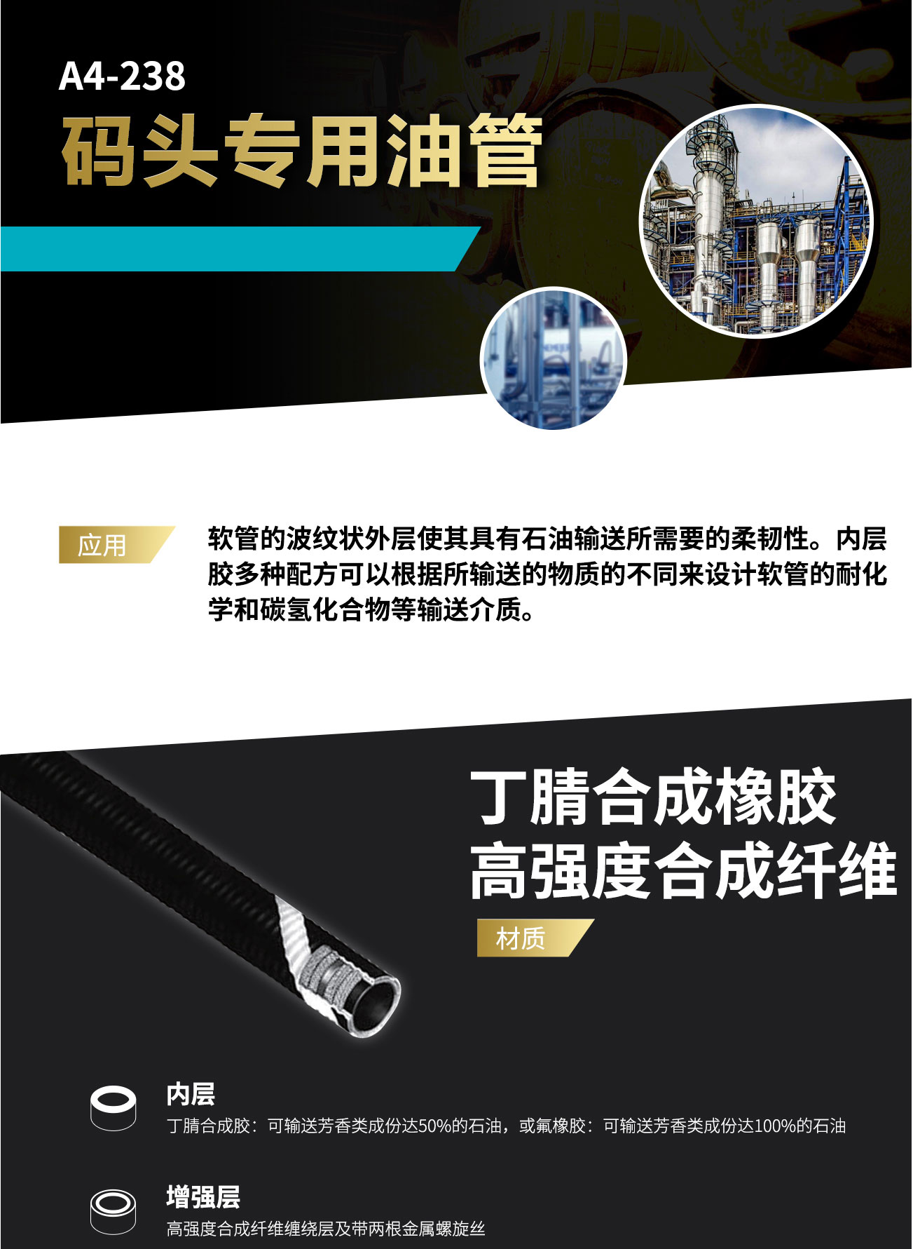 【内层】Nitrile橡胶:可输送芳香类成份达50%的石油,或氟橡胶:可输送含芳香类物质达100%的石油