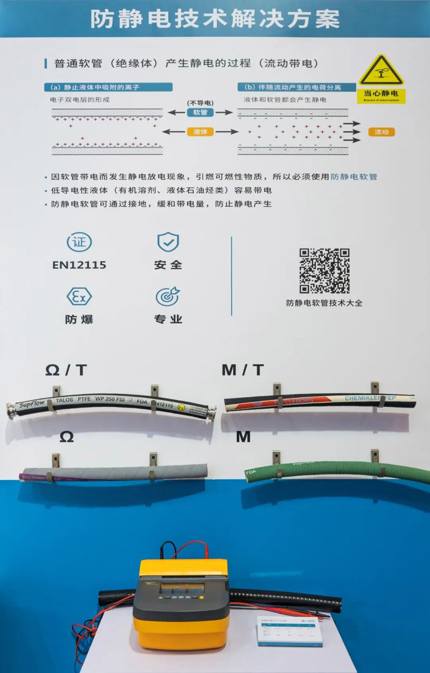 现场将为您展示多种符合生物制药行业要求的硅胶软管、塑料软管、特氟龙软管以及其他材质的软管。同时,现场展示导静电软管及总成导静电测试。以《EN2115-2011欧盟输送化工、可燃气体软管及总成规范》中规定的导静电标准为依据,通过标准的测试方法,试验对比四大导静电类别:Ω/T、Ω、M、M/T,帮助您更深刻的认识防静电软管的区别,助您找到正确合适的防静电软管。
