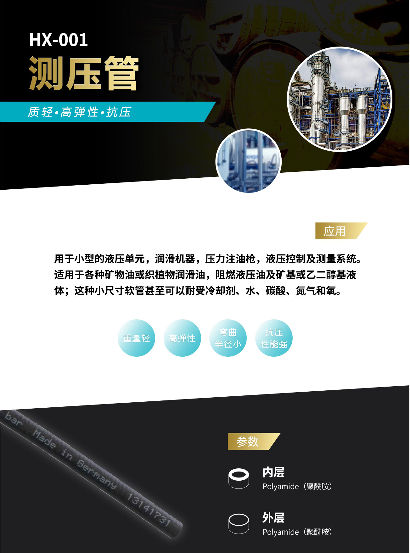 用于小型的液压单元,润滑机器,压力注油枪,液压控制及测量系统。适用于各种矿物油或植物润滑油,阻燃液压油及矿基或乙二醇基液体;这种小尺寸软管甚至可以耐受冷却剂、水、碳酸、氮气和氧。