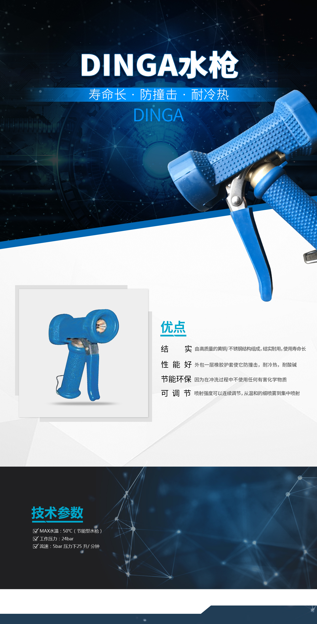 该款水枪由高质量的黄铜/不锈钢结构构成,很结实耐用,使用寿命长;外包一层耐酸碱的橡胶护套使得它在受到冲击以及在冷热环境中得到保护;该水枪在冲洗过程中不使用有害化学物质,同时能有效节约水和能源。可连续调整所需的射流强度。可配套的软管口径有1/2″。