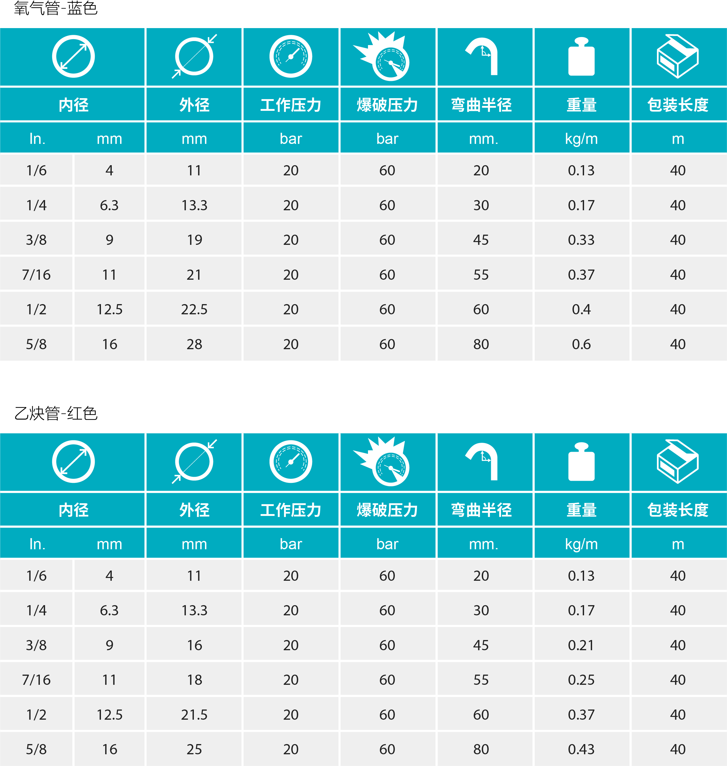 【外层】EPDM橡胶材质,红色走乙炔,蓝色走氧气
