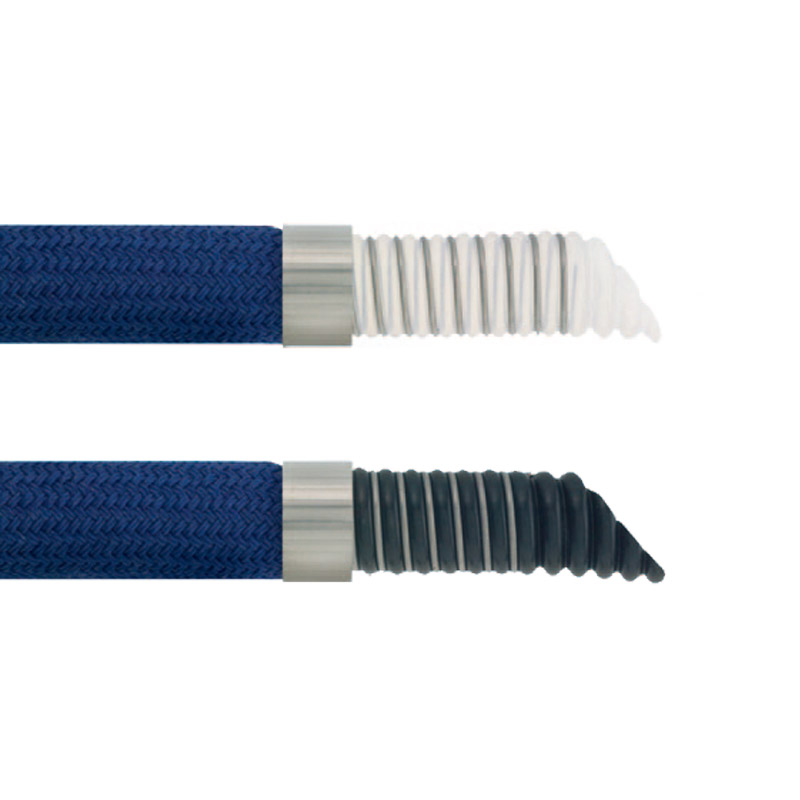 【特性】里层为波纹状的PTFE 软管,外层为聚丙烯编制外套,带螺旋钢丝,壁厚加厚 特别柔软,并且在高温时都有较好的耐压性能 标准与防静电内衬可供选择,通过ATEX 认证