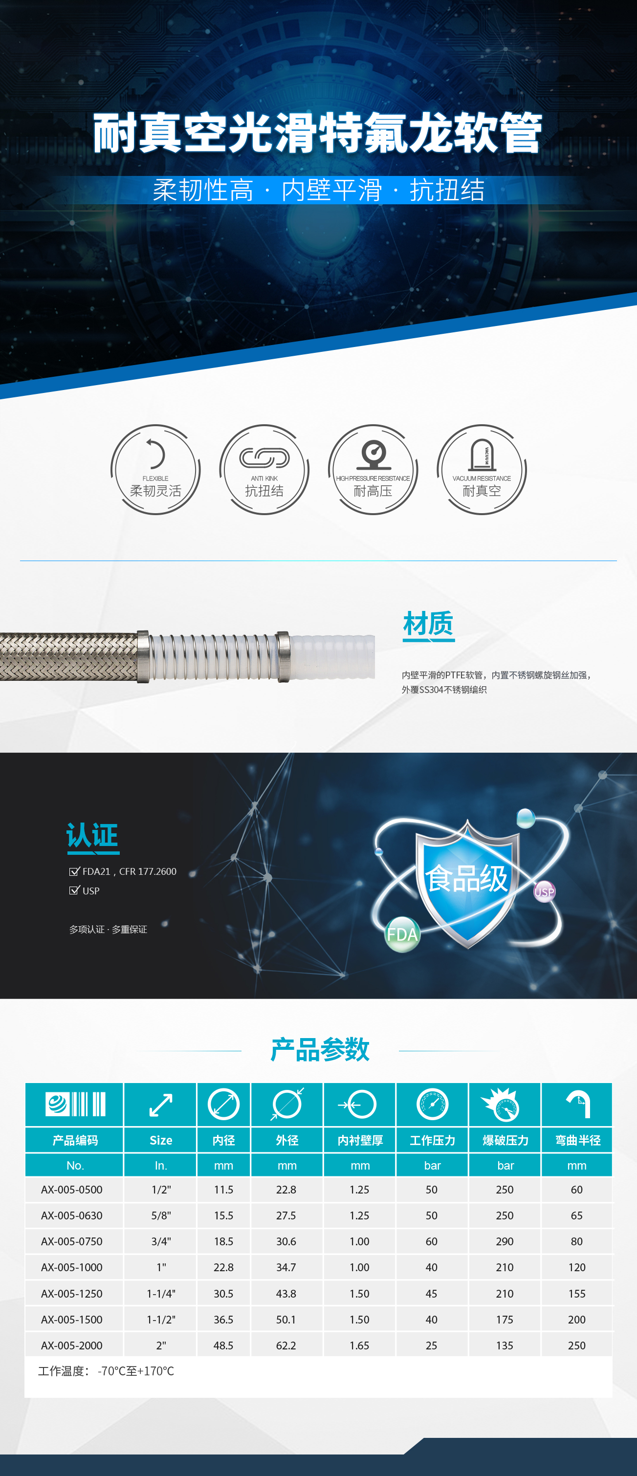 【特性】标准与防静电内衬可供选择 里层为光滑的PTFE 软管,外覆SS304 不锈钢编织和蓝色三元乙丙橡胶保护层 柔软,易清洗,易排水,表面光滑易擦洗 里层及表层均符合FDA 和USP 认证