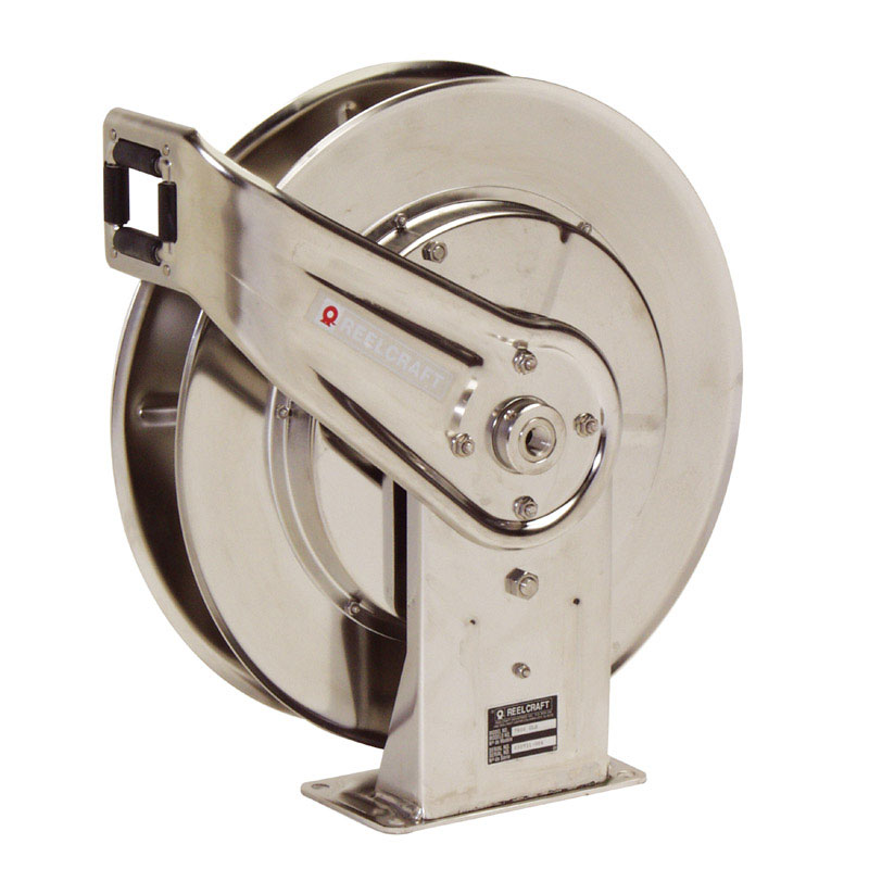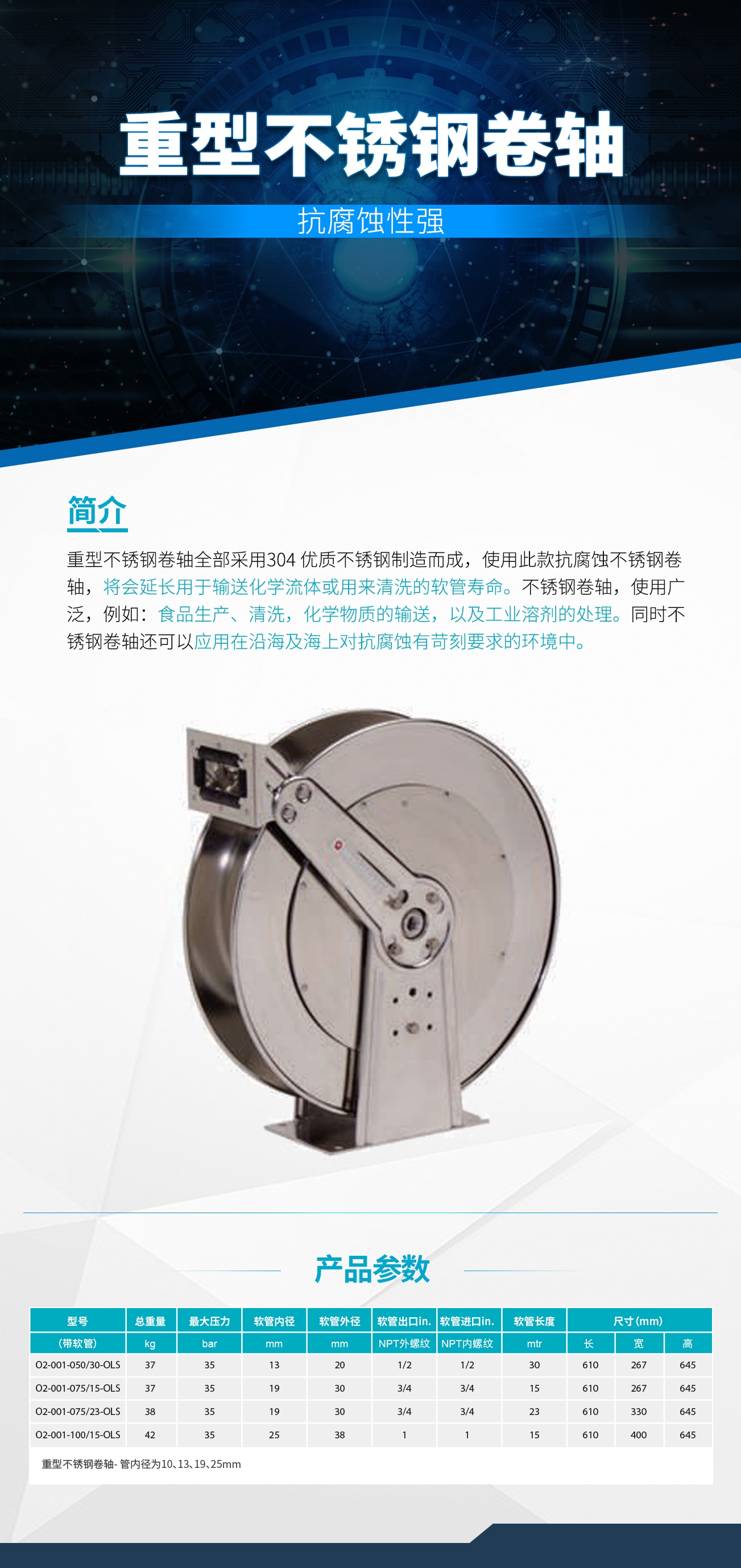 不锈钢卷轴全部采用美国304级优质不 锈钢制造而成,使用锐技抗腐蚀不锈钢卷轴,将会延长用于输送化学流体或用来清洗的软管的寿命。通过合理的存放 不使用的软管,可以减少由于软管存放杂乱无序引起的绊倒事故,同时改善工作环境。不锈钢卷轴使用范围广泛, 例如:食品生产、清洗,化学物质的输送,以及工业溶剂处理。同时不锈钢卷轴还可应用在沿海和海上对抗腐蚀有苛刻要求的环境中。旋转接头使用 Viton“O”型圈。