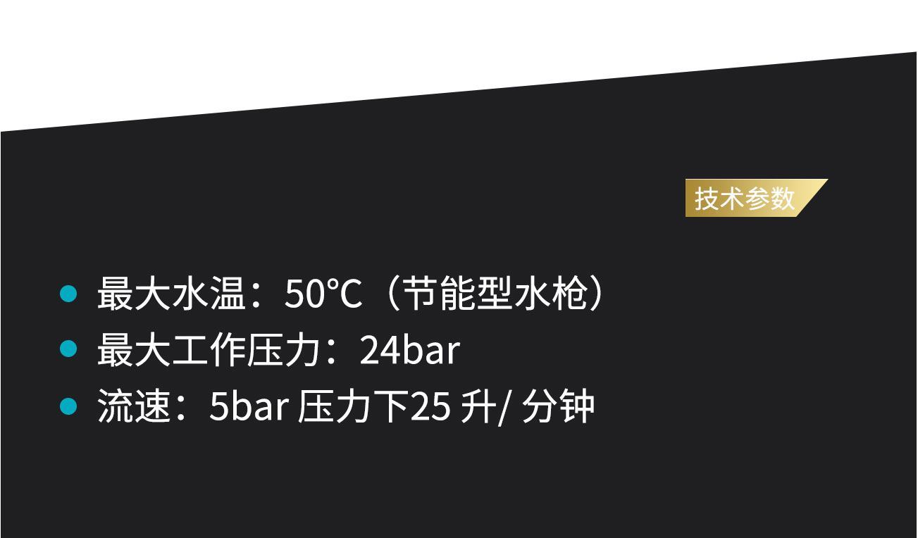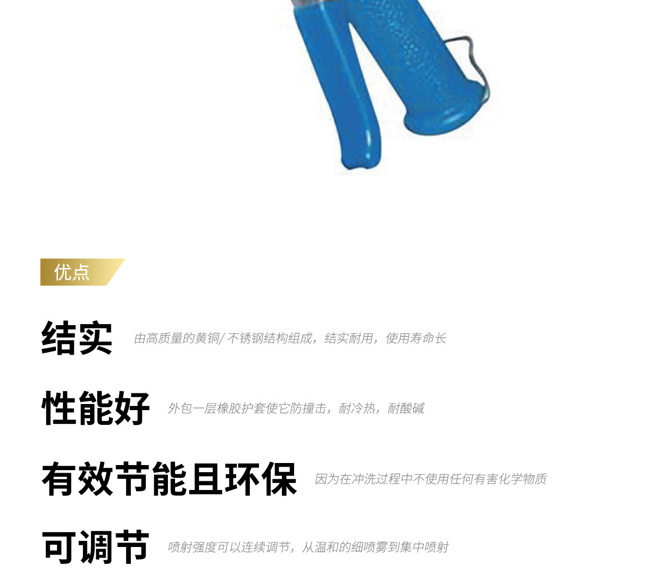 该款水枪由高质量的黄铜/不锈钢结构构成,很结实耐用,使用寿命长;外包一层耐酸碱的橡胶护套使得它在受到冲击以及在冷热环境中得到保护;该水枪在冲洗过程中不使用有害化学物质,同时能有效节约水和能源。可连续调整所需的射流强度。可配套的软管口径有1/2″。