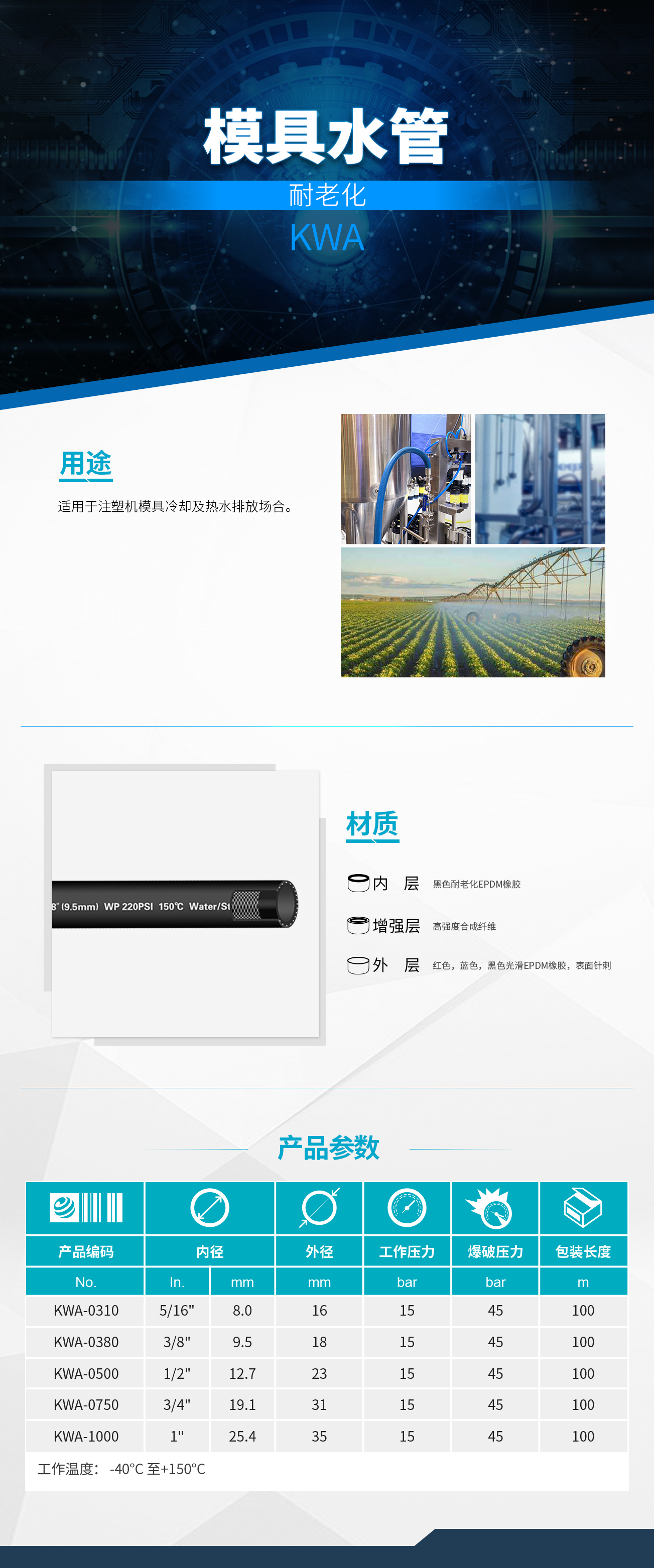 耐高温老化,适用于注塑模具冷却系统及其他循环冷却水场合。