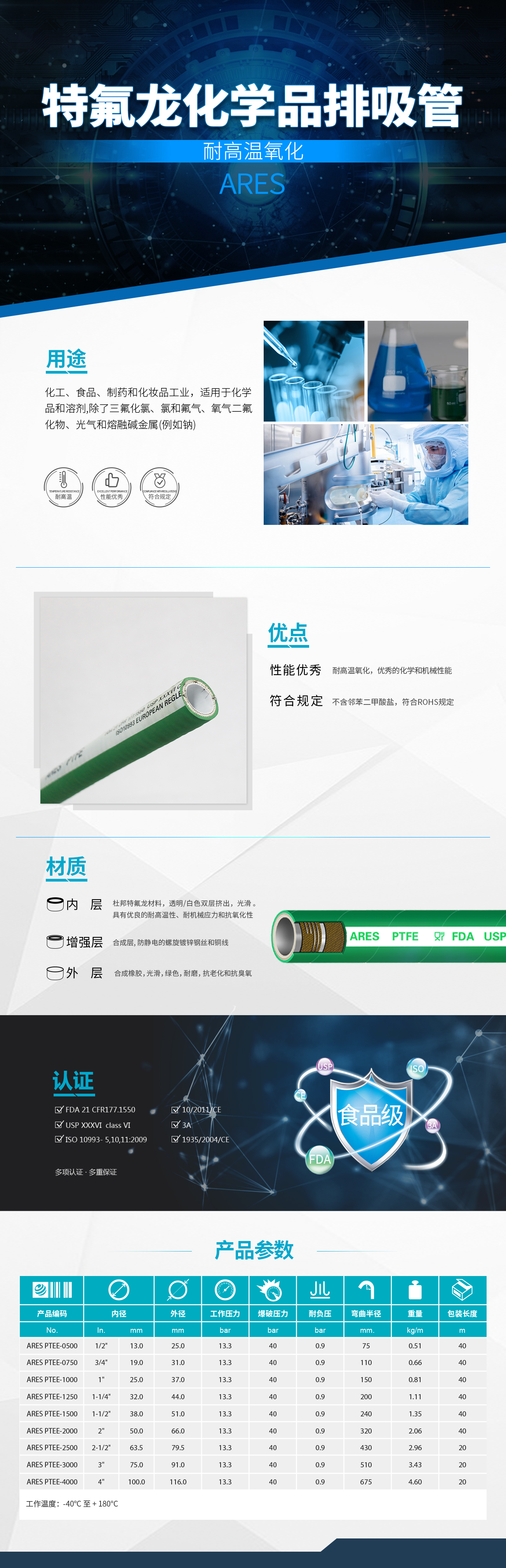 - 【内层】杜邦特氟龙材料,透明/白色双层挤出,光滑 。具有优良的耐高温性、耐机械应力和抗氧化性