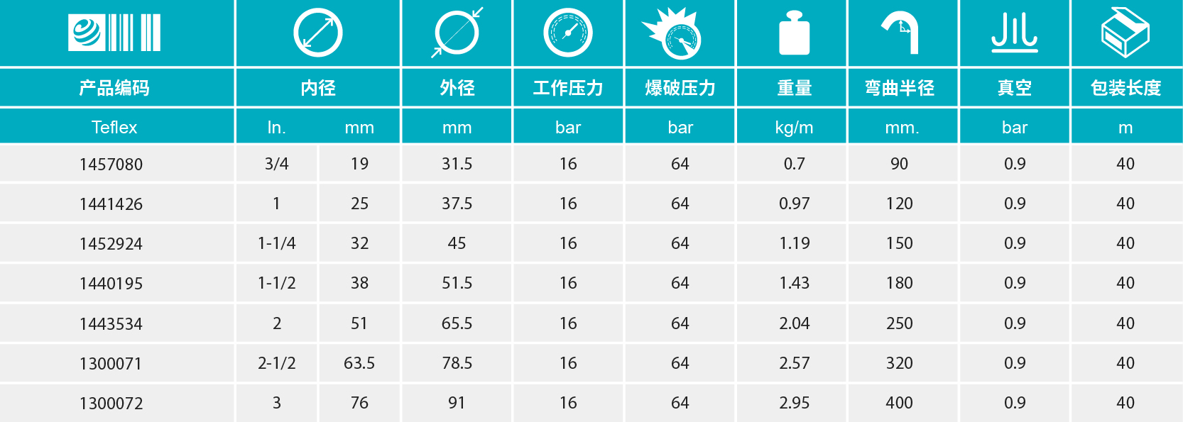 FEP内胶硬壁软管(Teflon),适用于绝大多数化学物质的输送,最高温度可达150℃,符合CIP标准。