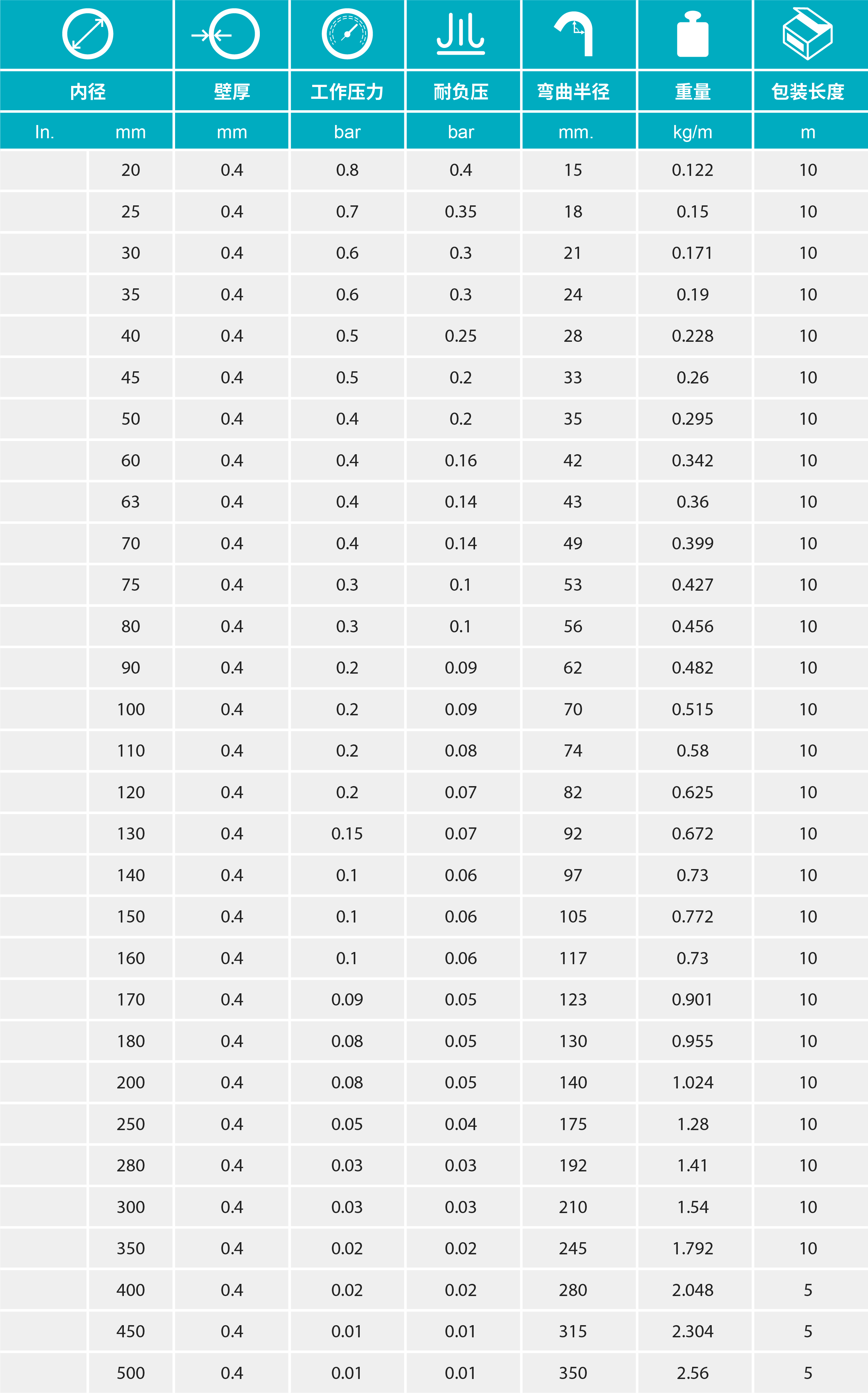 - 质极轻且具有良好的柔韧性,内壁平滑以保证物料在管内流动顺畅