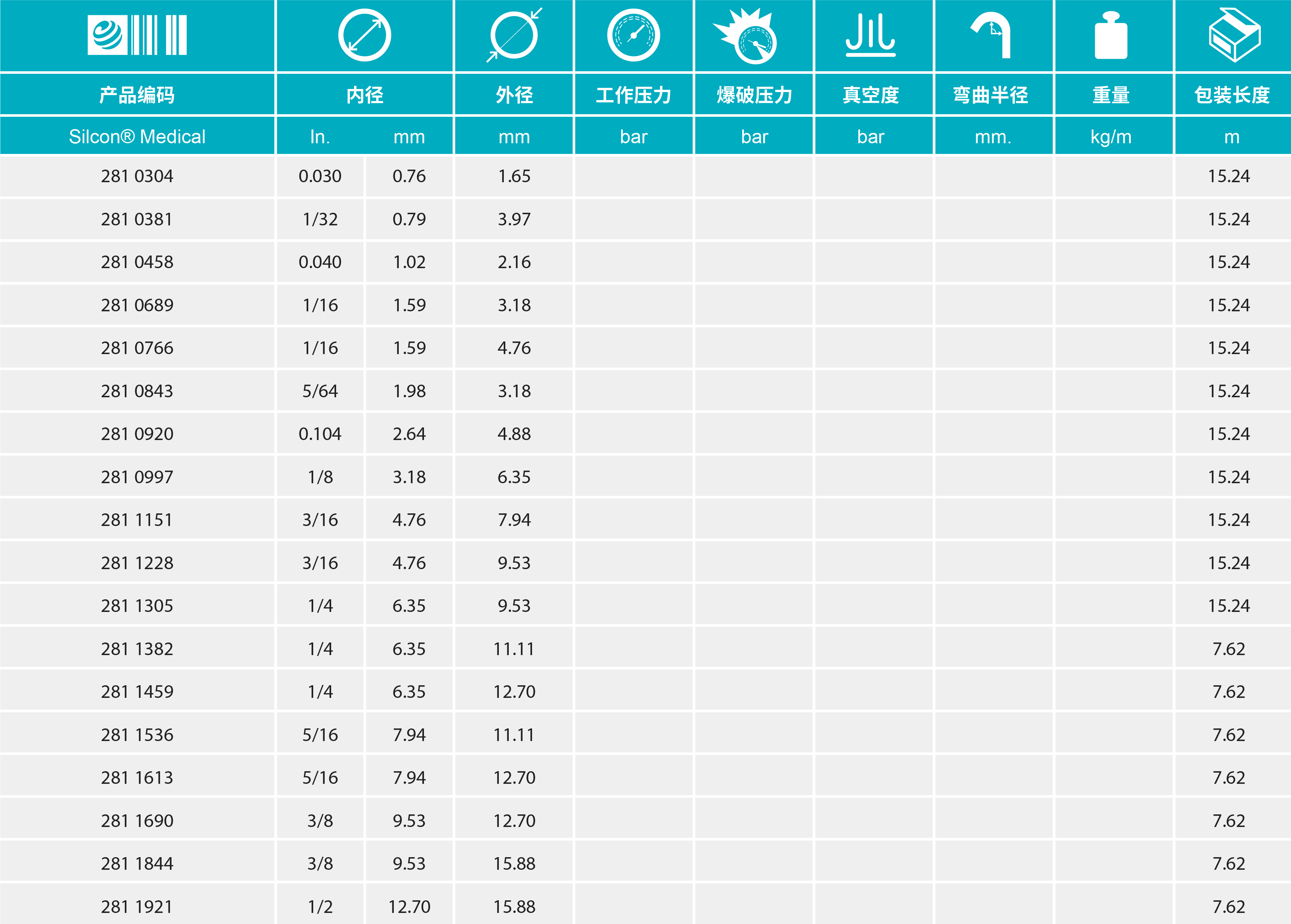 - 硅树脂弹性体达到USP Class VI和NSF-51要求,符合制药用软管的规范 在严格控制的环境和制造流程下制造完成 可重复使用——能经受反复消毒 对身体组织和体液不产生反应 自然的半透明颜色可供视觉监视溶液流动 无臭,无味,化学惰性 经过FDA认可,可用于接触食品表面,可以用作食品级软管 可用于蠕动泵