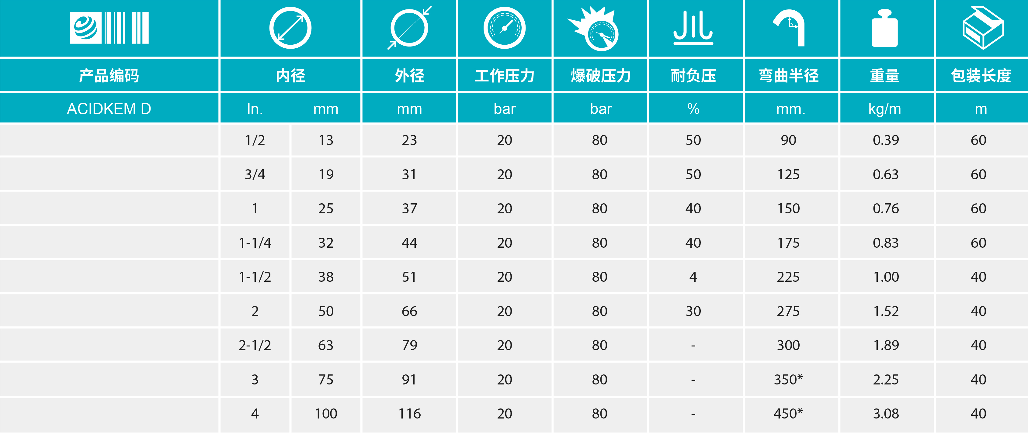 - 可用于吸排不同种类酸、碱、酯和酮的超柔软化学管;专门为化工厂、船舶、游艇和油罐车上使用设计;编织结构保证出色的柔软性和防扭结性能;导电的合成橡胶设计更加安全,尤其适用于有静电产生的场合;20bar的超高工作压力保证安全;分类等级:Ω/T。