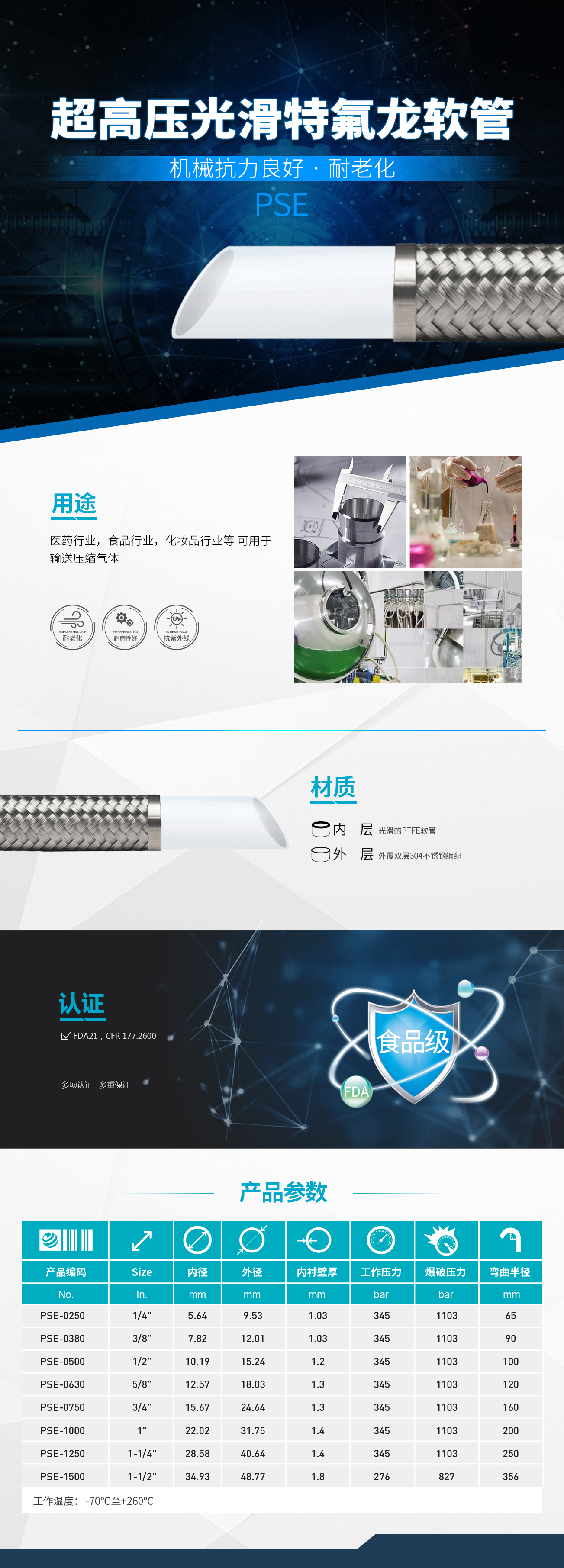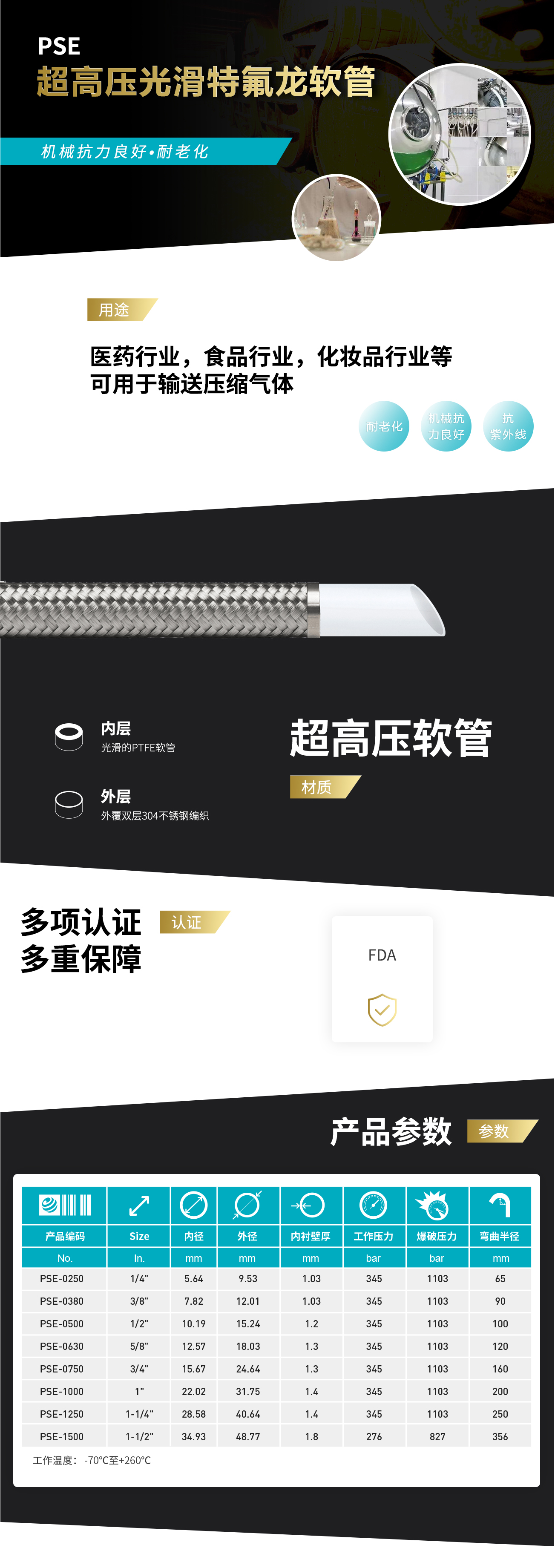 超高压软管,里层为光滑的PTFE 软管,外覆双层304 不锈钢编织