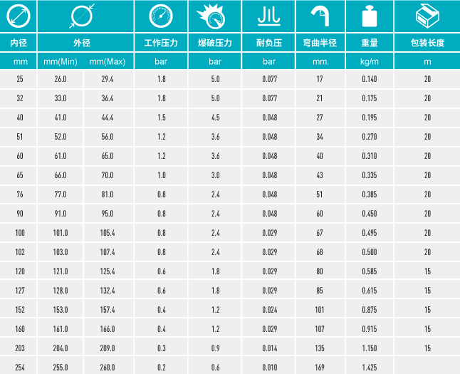 所有口径非螺旋处恒定壁厚0.5mm,TPU与特殊材质复合制成使得管壁永久导静电(R<〖10〗^8Ω),耐微生物和耐水解,抗紫外线