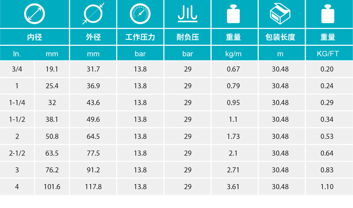 用于输送多种当前使用的化工产品。主要用于压力流、重力流输送或抽吸作业。可以采用达50 psi的无限制蒸汽对胶管实施清洁,或采用10%含量的氢氧化钠浸泡液,在212°F(100°C)的条件下来清洗胶管。