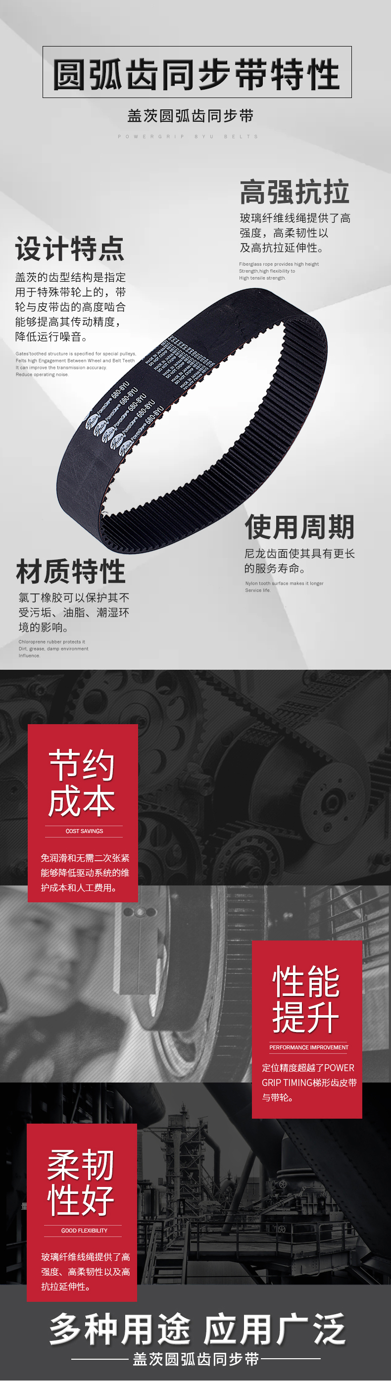 盖茨的齿型结构可和对应带轮匹配,带轮和皮带齿的高度啮合能够提高其传动精度,降低运行噪音。