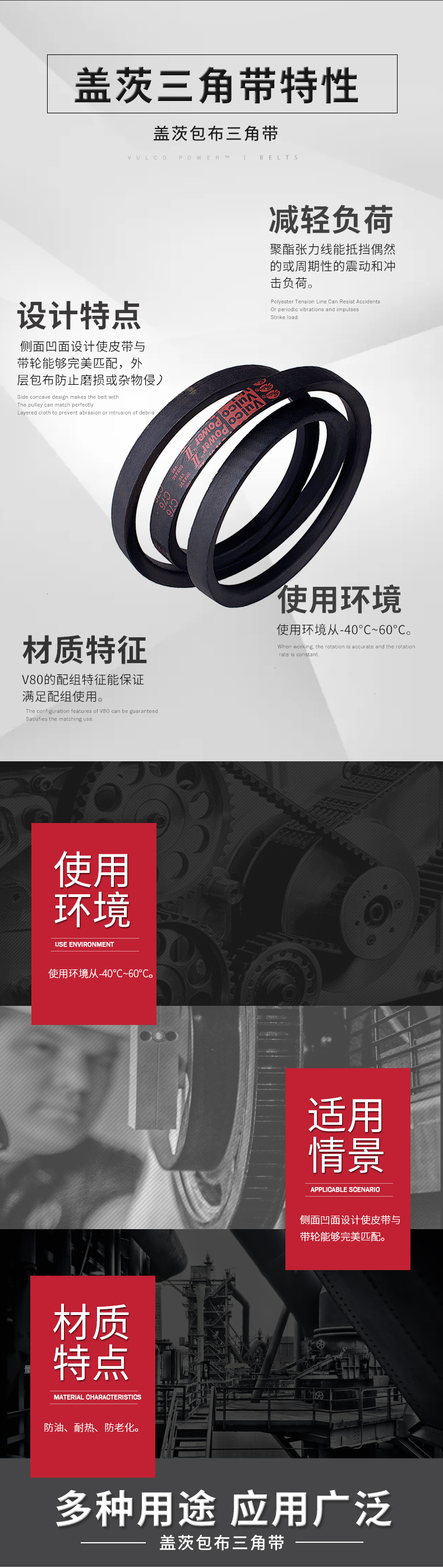 侧面凹面设计使皮带与带轮能够更好匹配,外层包布防止磨损或杂物侵入。