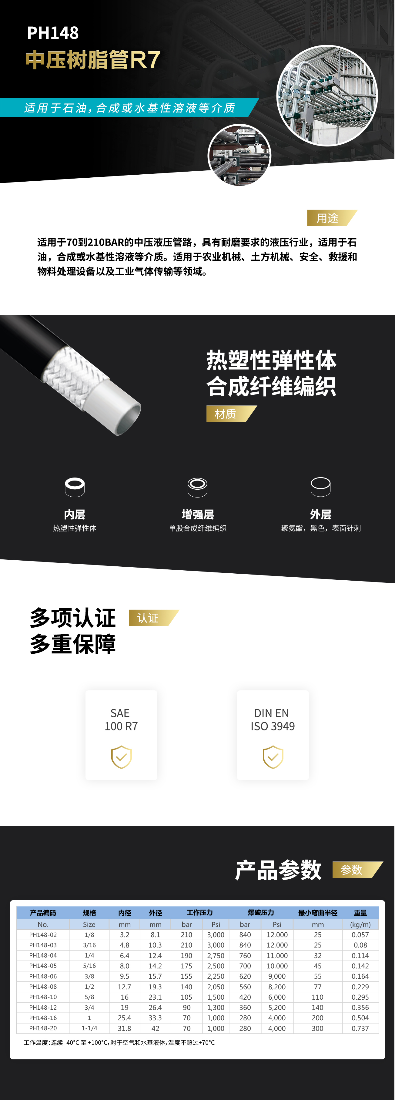 适用于70到210bar的中压液压管路,具有耐磨要求的液压行业,适用于石油,合成或水基性溶液等介质。适用于农业机械、土方机械、安全、救援和物料处理设备以及工业气体传输等领域。