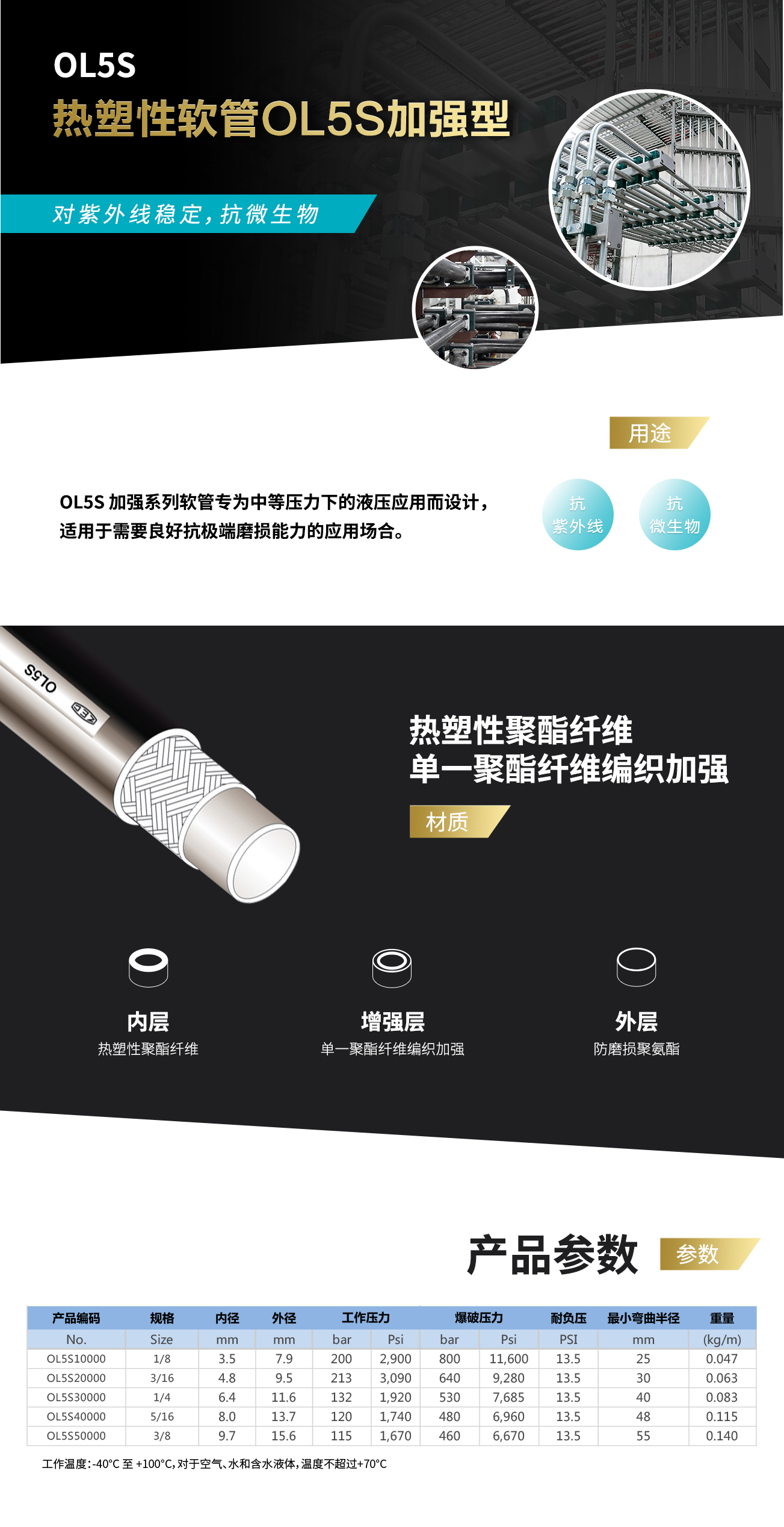 OL5S 加强系列软管专为中等压力下的液压应用而设计,适用于需要良好抗磨损能力的应用场合。