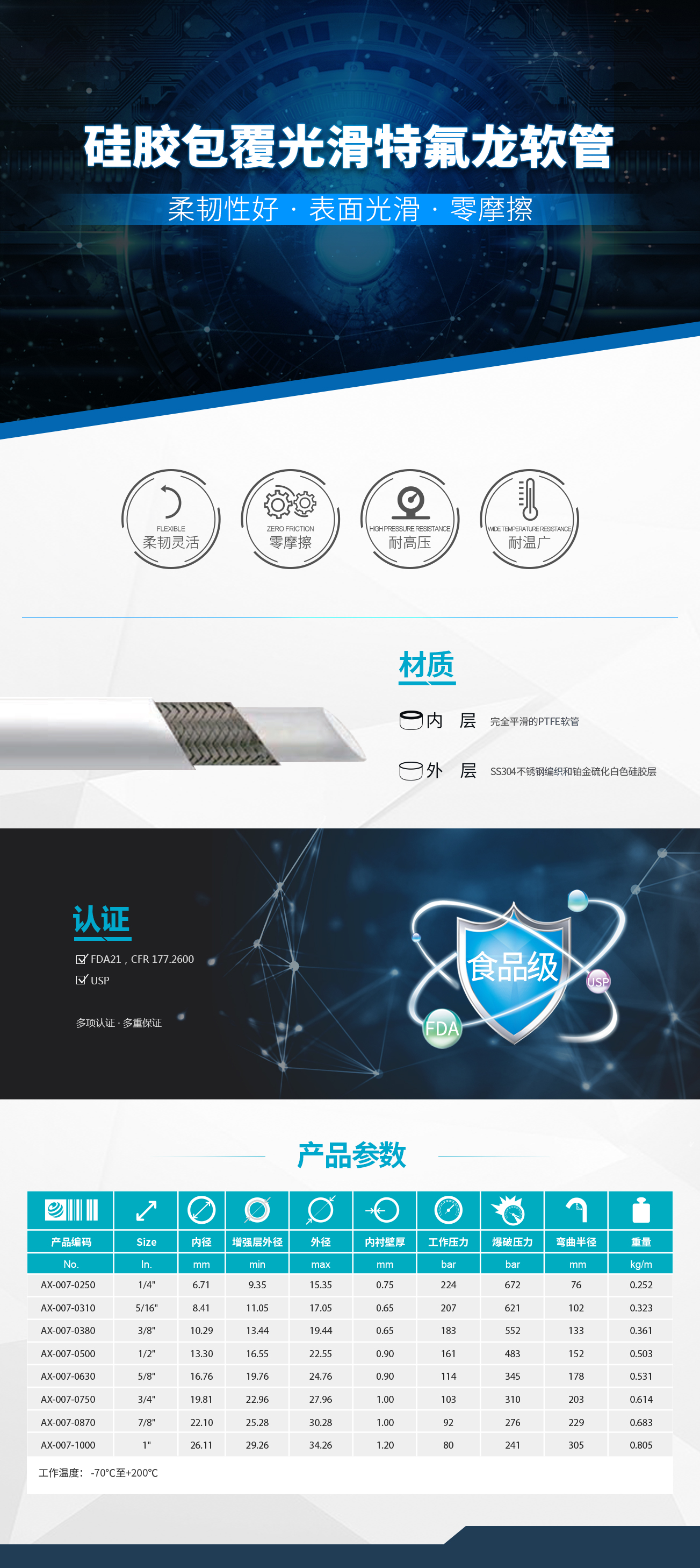 里层为平滑的PTFE软管,外覆SS304不锈钢编织和铂金硫化白色硅胶层 高性能的产品,具有很好的柔韧性,表面光滑易擦洗,零摩擦,耐高压和耐温广