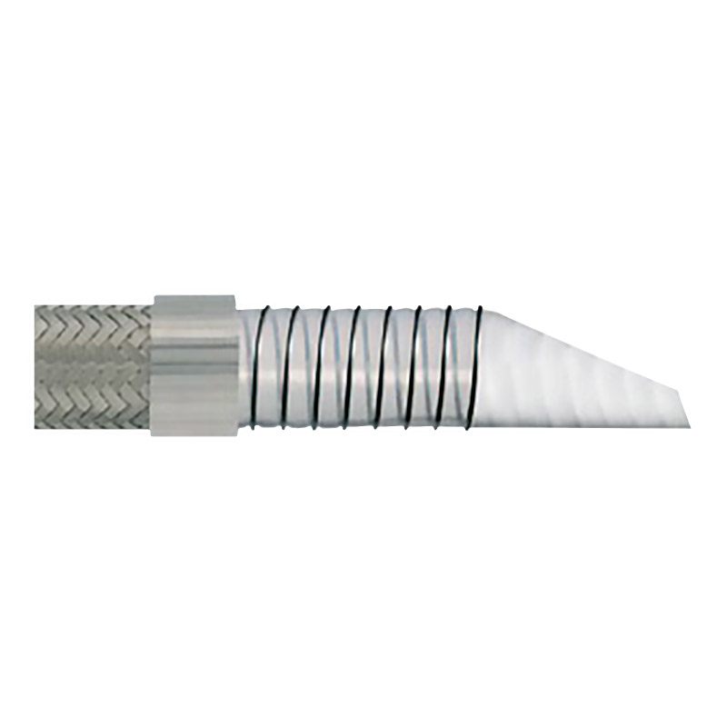内壁平滑的PTFE软管,内置不锈钢螺旋钢丝加强,外覆SS304不锈钢编织,标准与防静电内衬可供选择