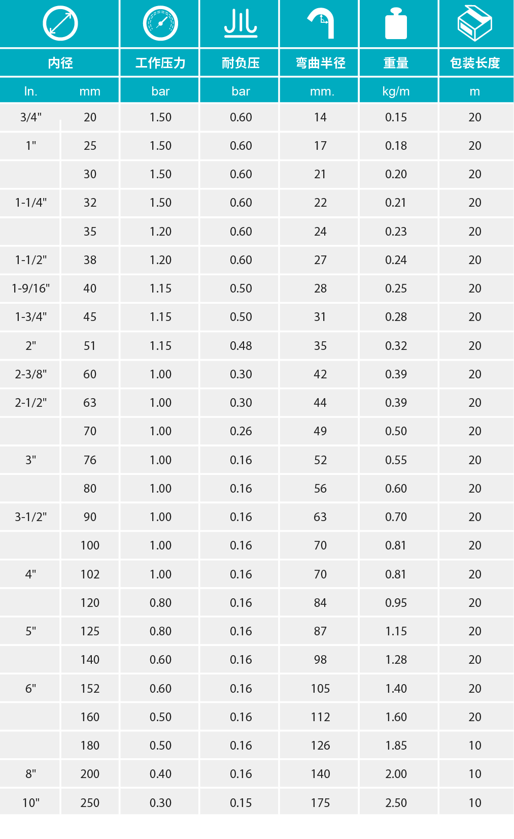 - 内壁平滑的食品级软管,非常适用于抽吸和输送食品工业中的研磨物料,粉末和颗粒,以及医药实验室中的药物 适用于工业吸尘,地板清理,割草和喷涂行业,木材加工行业,机器人和X光机的线路管道。
