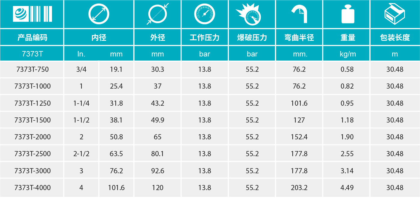 小波纹状外壁,具有更好的柔韧性和耐用性能,能够输送98%的工业化学品,适用于化学品生产和运输过程中的吸入和排放。7373T最长可到200英尺。