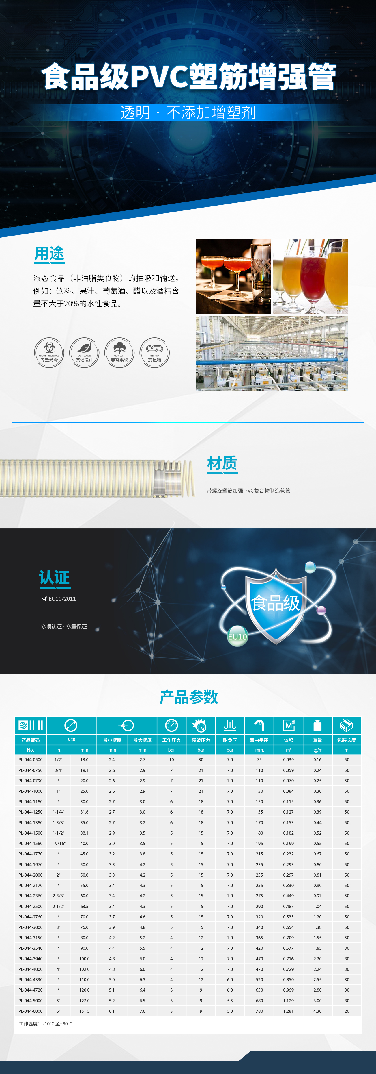 进口软管液态食品(非油脂类食物)的抽吸和输送。例如:饮料、果汁、葡萄酒、醋以及酒精含量不大于20%的水性食品。