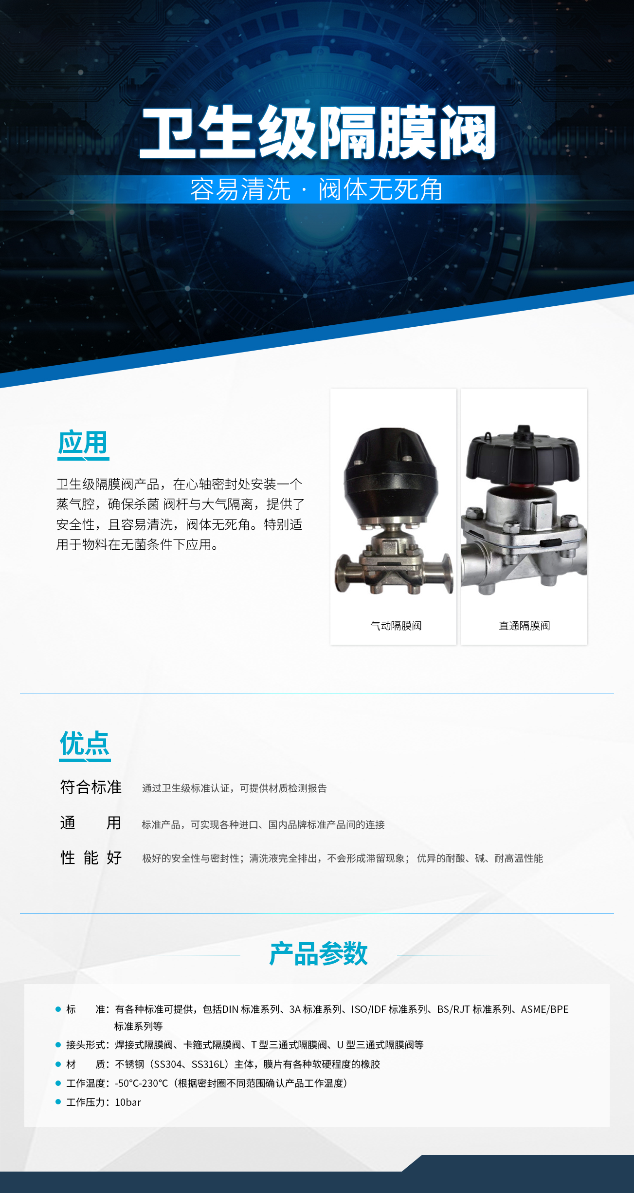 - 卫生级隔膜阀产品,在心轴密封处安装一个蒸气腔,确保杀菌阀杆与大气隔离,提供了安全性,且容易清洗,阀体无死角。特别适用于物料在无菌条件下的应用。