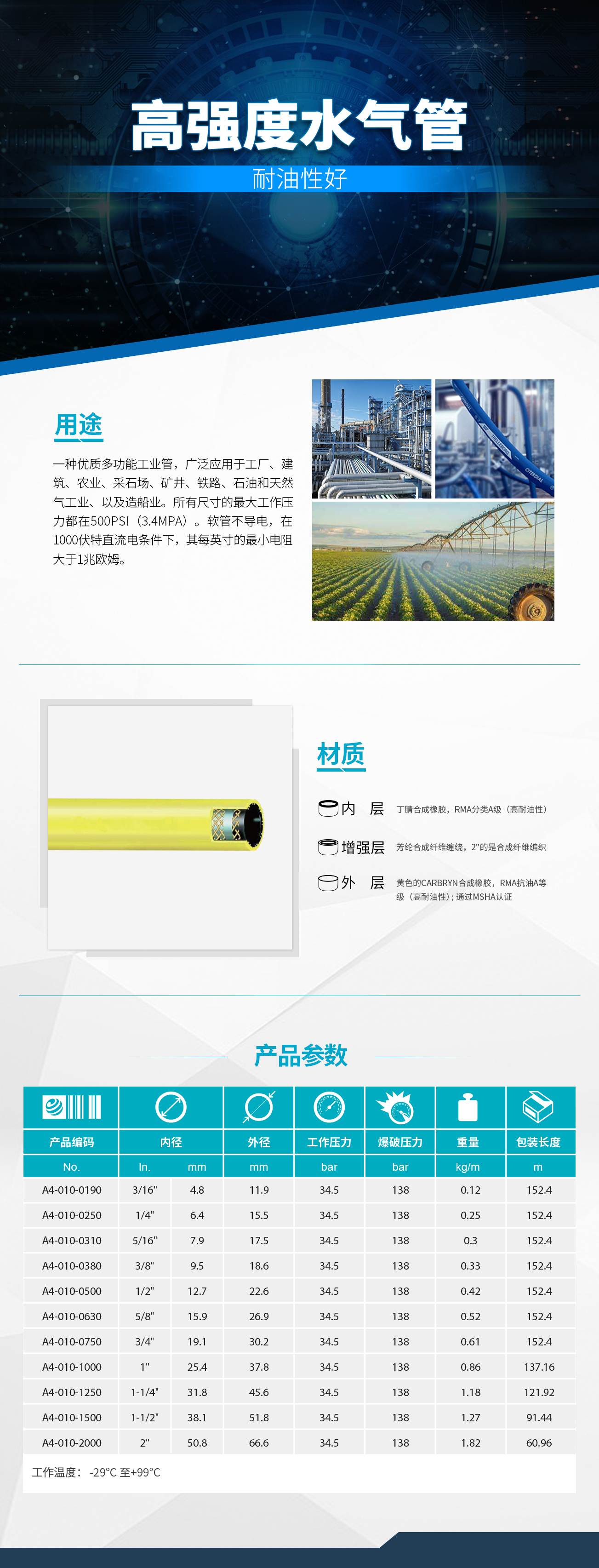 一种优质多功能工业管,广泛应用于工厂、建筑、农业、采石场、矿井、铁路、石油和天然气工业、以及造船业。所有尺寸的工作压力都在500psi(3.4Mpa)。软管不导电,在1000伏特直流电条件下,其每英寸的电阻大于1兆欧姆。