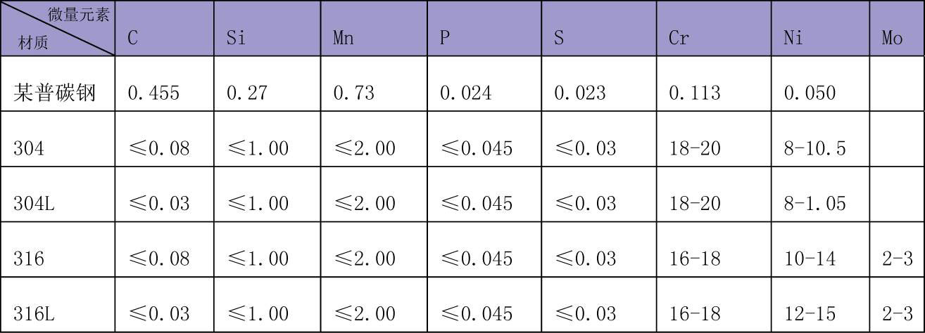 304,304L,316,316L这4个牌号,成分对比如下表,可以看出:不锈钢与碳钢的成分在微量元素方面差别很大,C,Cr,Ni是主要差别。316系列含Mo 及Ni多于304系列,低碳不锈钢含碳量只有0.03。