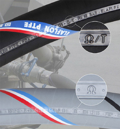 ● Ω =高安全性。由导电橡胶混合物制成。适用于正常使用,例如充装对应IIA的液体。如果软管是部分用于危险区域-例如,防爆区域限制在接头区域,此类软管也可以被接受的。