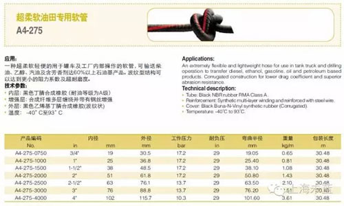 这个主要是在德国康迪泰克的产品体系中有所体现。此类软管,其内壁胶料柔韧性好,而其外部,是螺旋型瓦楞结构,使得软管在弯曲过程中,其外壁可以释放软管的柔韧性,自身没有限制。如A4-275,它就是一款这种结构的产品,耐油性很好,专用于油田输送领域。