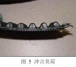 剧烈的冲击负荷可以导致皮带芯线以粗糙的不平均的形式断裂,如图4所示。皮带齿部在带轮中经过即时冲击负荷后可发展成齿根开裂和/或齿部脱落。如果冲击负荷只发生一次,或在皮带固定的位置重复循环,皮带的其余齿部可能看起来还是正常的。图5说明了齿根开裂如何在齿内进行扩散。在齿根形成的裂缝有时会扩散到齿尖。积聚过多裂缝时齿部就会剪切,就会只剩下齿的一部分。