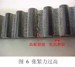 同步带安装张力过高会导致皮带齿部剪切或断裂。很多张力过高的皮带在皮带齿面上都清晰地留下了轮齿磨损的痕迹。图6是皮带被压过的表面区域和齿根开裂的例子。齿根开裂通常会通过芯线扩展到其相邻的开裂处,个别的皮带齿部会慢慢脱落。图7是张紧力过高的皮带在大带轮上被磨过的痕迹。过高的皮带表层压力会导致皮带大面积区域磨损,导致皮带芯线暴露在外。为了防止这样的磨损问题,适当的皮带安装张力值必须要准确的设定。
