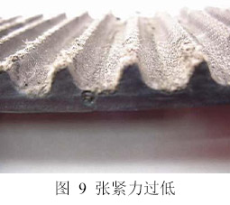 当皮带齿部爬出带轮轮槽而自动张紧时,在橡胶撕裂和齿部脱落前,皮带容易产生跳齿。跳齿引起的皮带芯线损伤往往导致皮带强度提前失效,损伤情况与折曲失效的芯线断裂情况类似(整齐断裂)也同样类似于冲击负荷的断裂(成锯齿状并有角度的)。如果皮带没有跳齿并且在自张紧时也在继续运转,这中情况下经常发生皮带齿部过度磨损。这种齿部磨损叫做勾形磨损,是由于皮带齿部与带轮不匹配,如图9所示。勾形磨损是由于皮带的安装张力不够和不牢固的传动系统在低张力的情况下中心距变化所导致的。