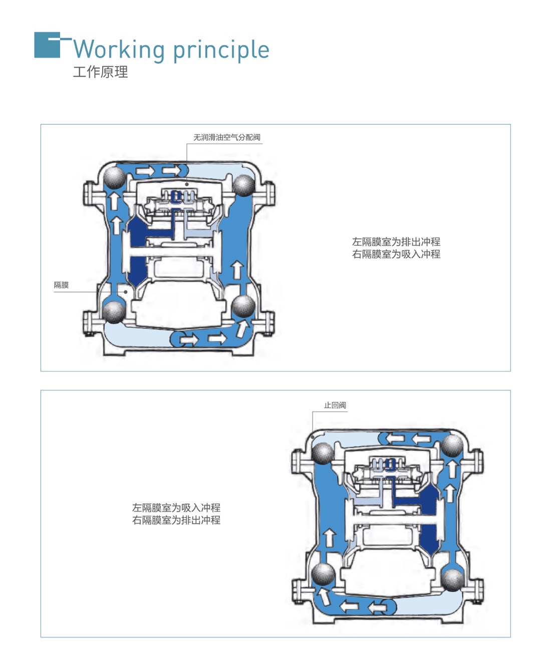 当空气分配阀让压缩空气进入左隔膜室,隔膜受压,往外推出,而形成压送冲程,在压送部内的介质受力离开左面外隔膜室、止回阀、汇流管,而后由泵的出口流出。排出口位置位于泵的顶部,当左隔膜受压推出时,隔膜连接杆在内部拖动右隔膜向内缩回形成吸入冲程,这样介质充满右侧外隔膜室,介质在入口处流入泵内,通过一个打开的入口止回阀充满腔体,在这一循环动作完成后,空气分配阀将自动变换位置,使空气切换至另一隔膜室,反向重复上述循环动作。即两边隔膜室呈现交替性的压送及吸液动作。