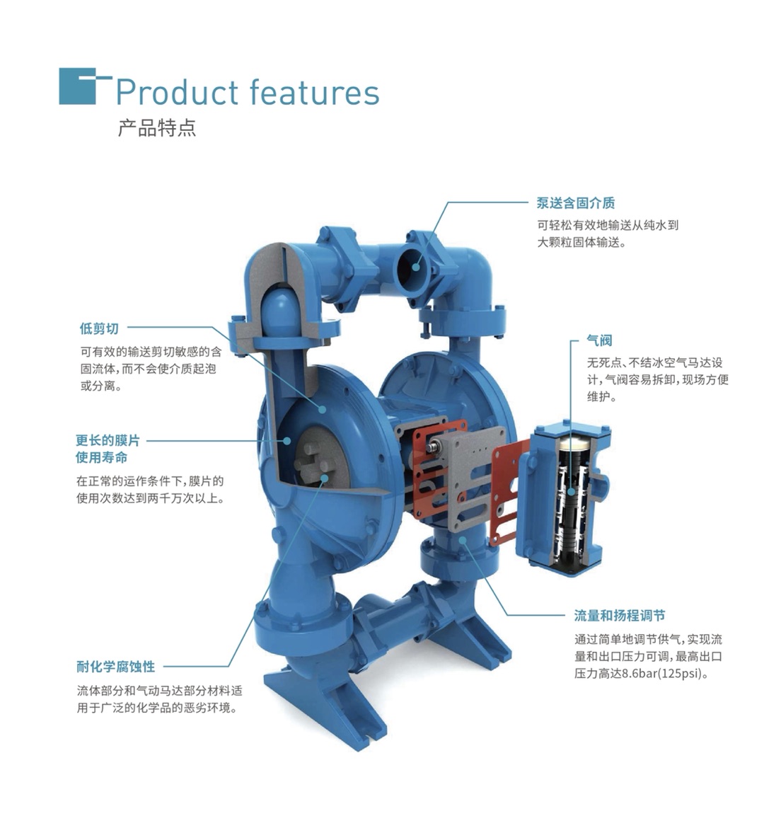 耐化学腐蚀性:流体部分和气动马达部分材料适用于广泛的化学品的恶劣环境。
